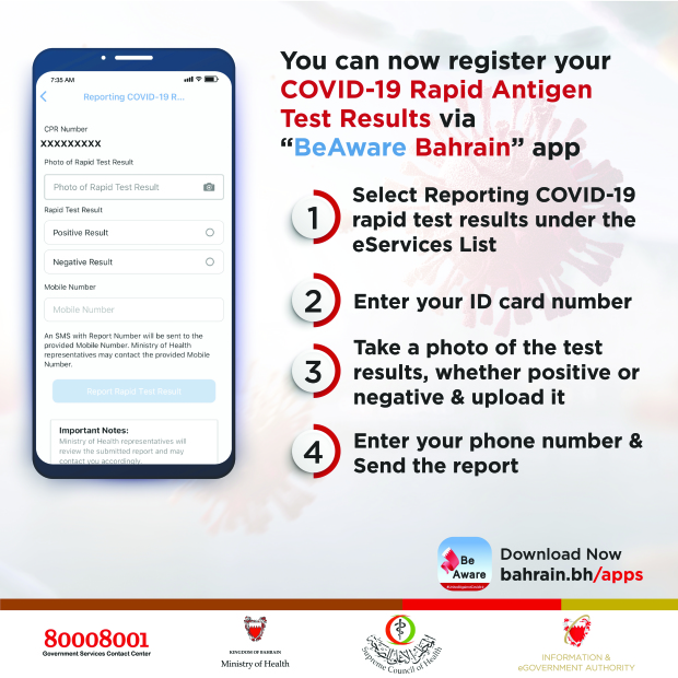 PEOPLE can now submit the results of their Covid-19 Rapid Antigen Tests by uploading photos on the ‘BeAware Bahrain’ app.