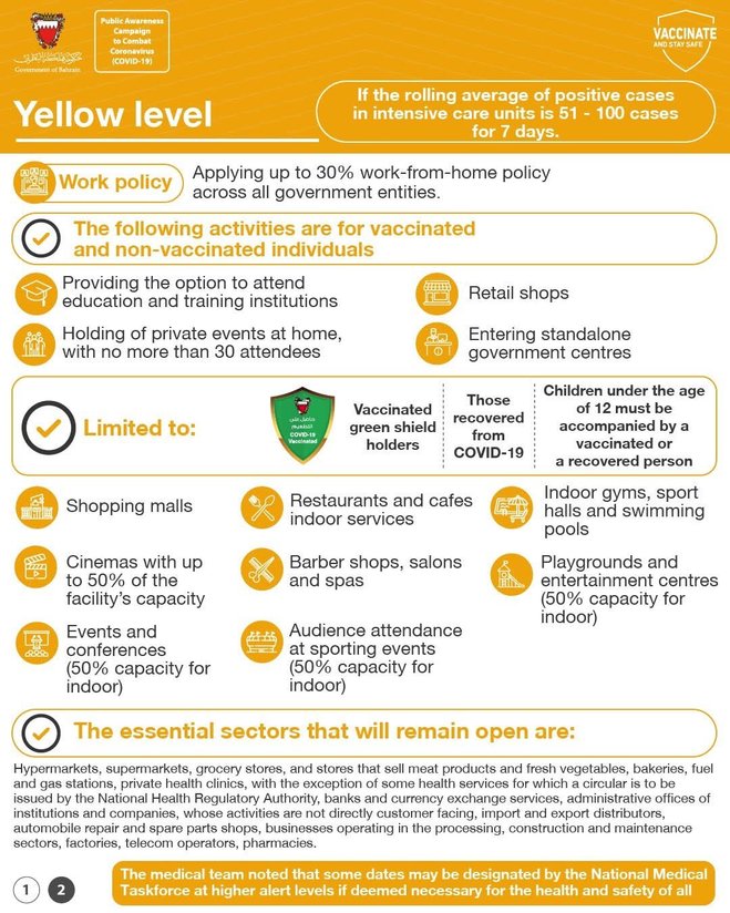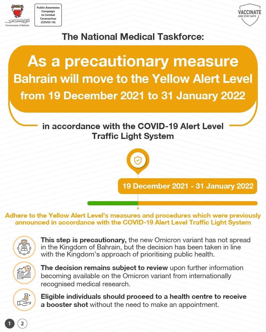 BAHRAIN will move to the yellow zone of Covid-19 restrictions from Sunday until January 31, 2022, it has been announced.