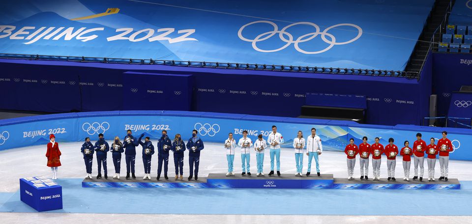 Silver Medallists Nathan Chen of the United States, Madison Hubbel of United States, Zachary Donahue of the United States, Vincent Zhou of the United States, Karen Chen of the United States, Brandon Frazier of the United States, Alexa Knierim of the United States and Chock Madison of the United States, and Gold Medallists Kamila Valieva of the Russian Olympic Committee, Mark Kondratiuk of the Russian Olympic Committee, Anastasia Mishina of the Russian Olympic Committee, Aleksandr Galliamov of the Russian Olympic Committee, Nikita Katsalapov of the Russian Olympic Committee and Victoria Sinitsina of the Russian Olympic Committee, and Bronze Medallists Sakamoto Kaori of Japan, Uno Shoma of Japan, Komatsubara Misato of Japan, Koleto Tim of Japan, Miura Riku of Japan, Kihara Ryuichi of Japan, Higuchi Wakaba of Japan and Kagiyama Yuma of Japan celebrate on the podium during the flower ceremony. (Reuters Photo)