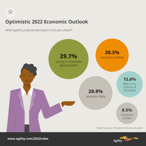 Most logistics industry executives see moderate-to-strong economic growth and little or no chance of recession in 2022, even without immediate relief from the snarled supply chains and sky-high ocean and air freight rates triggered by the Covid-19 pandemic.
