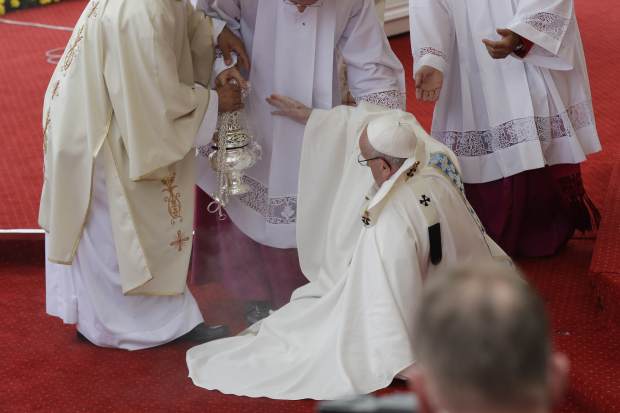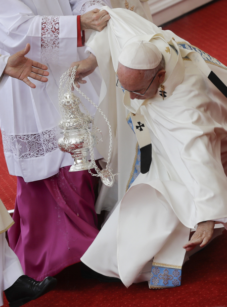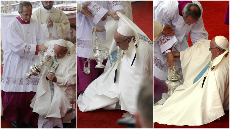 As Francis walked up to the alter he tripped and fell over, but was quickly helped to his feet by others.