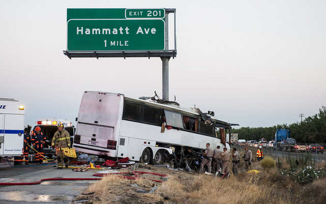 Atwater, California: A charter bus veered off a central California highway before dawn Tuesday and struck a pole that sliced the vehicle nearly in half, killing five people and sending five more to hospitals, some with lost limbs, authorities said.