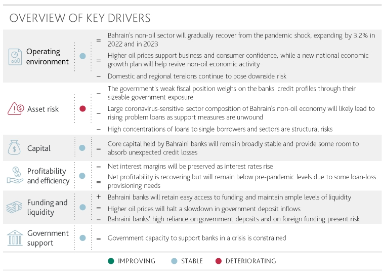 Although the global fallout from Russia’s invasion of Ukraine is increasing uncertainty, the impact on Bahraini banks remains low at this stage given their limited direct exposure to both countries while any domestic and geopolitical tensions continue to present downside risks.