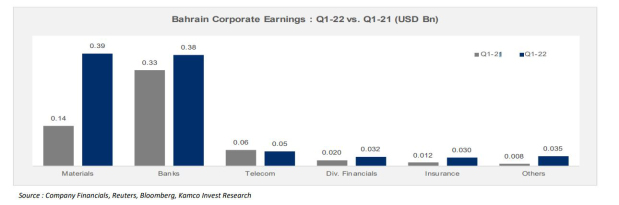 In the banking sector, Al Baraka Banking Group and Ahli United Bank posted the largest increases in absolute net profits during Q1-2022 pulling up the total net profits of the sector which witnessed a 15.5pc overall increase to reach $384.5m.