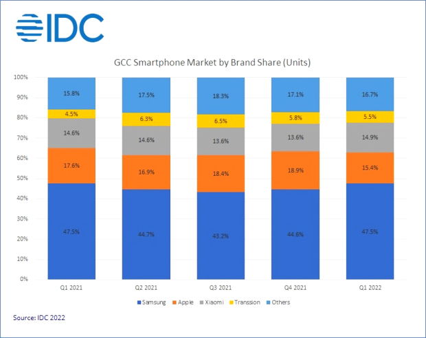 Samsung led the GCC smartphone market in terms of shipments in Q1-2022 with 47.5pc share