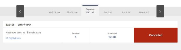 PASSENGERS flying to Bahrain from London on British Airways (BA) today will have to reschedule their return as the flight has been cancelled.