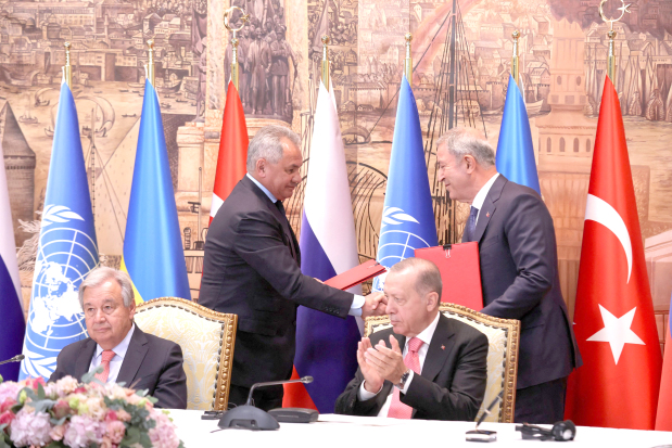 Russian Defence Minister Sergei Shoigu and Ukrainian Infrastructure Minister Oleksandr Kubrakov signed separate, identical deals with Guterres and Turkish Defence Minister Hulusi Akar at a ceremony in Istanbul.