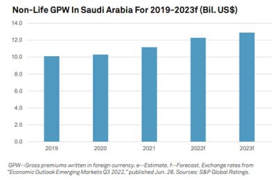 S&P Global Ratings foresee Gross Premium Written (GPW) in Saudi Arabia to grow by approximately 5%-10% in 2022. GPW is a closely monitored earnings metric because it reflects the growth or decline in the new insurance business.