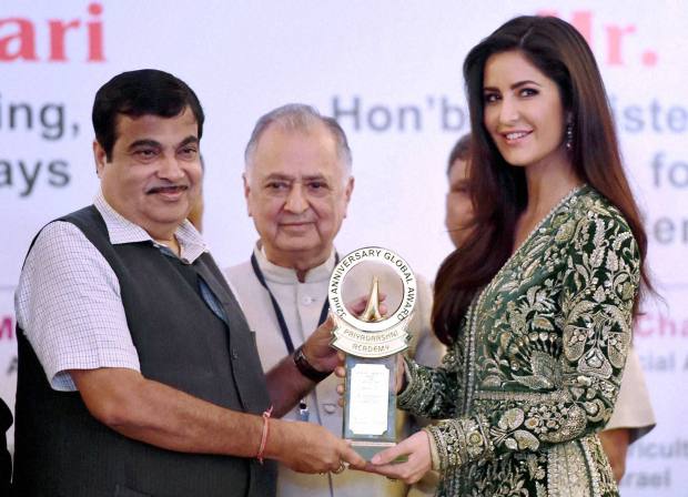Nitin Gadkari, Union Minister for Shipping, Road Transport and Highways honors Bollywood actress Katrina Kaif with the Smita Patil Memorial award during the Priyadarshni Academy Global awards ceremony in Mumbai on Monday. (PTI Photo)
