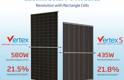 Trina Solar’s latest Vertex modules are the latest innovative upgrade to the 210 mm Vertex Technology platform with rectangular cells – the first-ever non-square cells – and a lower number of cells with better hotspot performance, producing both an optical and electrical performance of 2-3%.