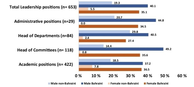 Of the 653 leadership positions in Bahrain that were on the study, 388 (59.4pc) were held by men and 265 (40.6pc) were held by women.