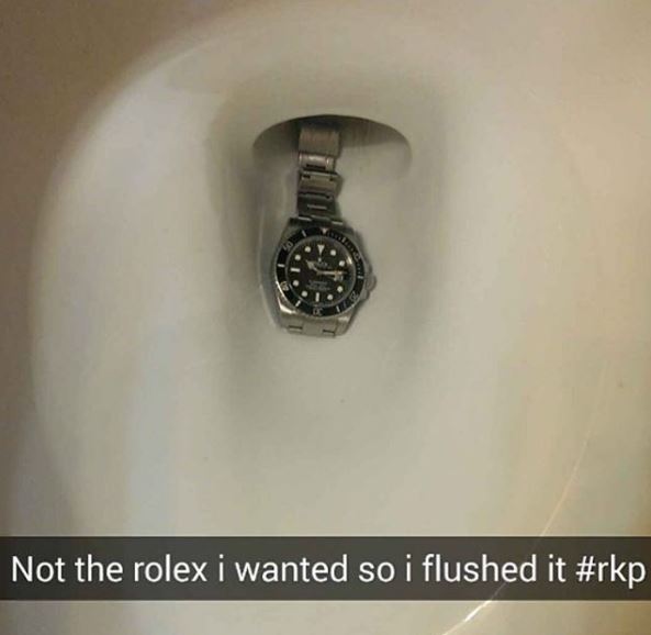 In one photograph, a Rolex watch is being flushed down the toilet because it was not the model the kid wanted.