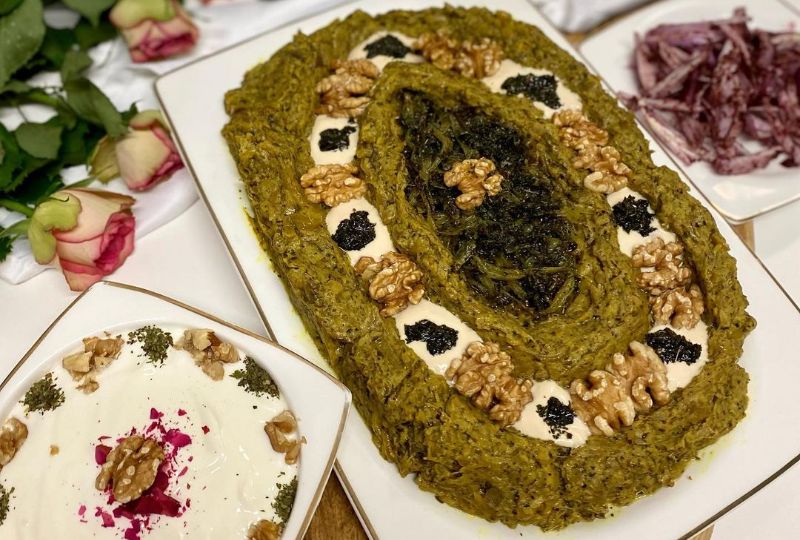 It is a Persian dish made from drained yoghurt and eggplants. It is usually garnished with liquid saffron, sautéed onions, and walnuts. It is a high source of protein. It is eaten with bread and can be served either as an appetizer or as a main dish.