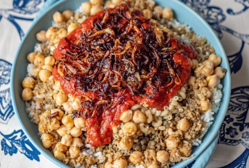 Egypt’s national dish is made with rice, pasta, and lentils, usually topped with tomato sauce and garnished with fried onions. It is a rich source of carbs. It can also be served with garlic and hot sauce.