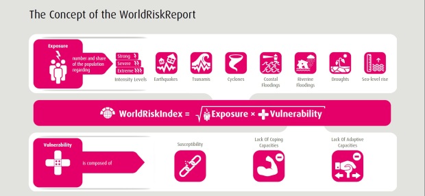 For the vulnerability aspect, socio-economic factors and vulnerability to disease and conflict are assessed to determine susceptibility. This is then stacked with health care capabilities and government stability to determine coping capability and finally, education, research and investment capacities help determine the adaptive capacity of the country. The exposure and vulnerability indices are then added and the square root of the sum is used to generate the WRI.