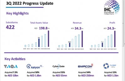 International Holding Company (IHC), one of the largest corporate investment holding firms in the Middle East and Africa, headquartered in Abu Dhabi, reported 236% surge in profit for the 9-month period to AED24 billion ($6.53 billion), compared to the same period last year.