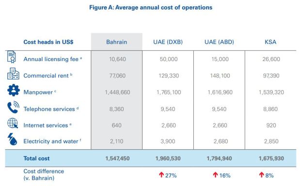 Bahrain is the most competitive GCC country when it comes to costs of operating a financial services business, with the kingdom offering savings of up to 27 per cent over regional peers.