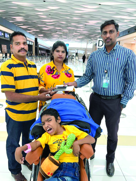 The couple with their autistic son Harish at the airport