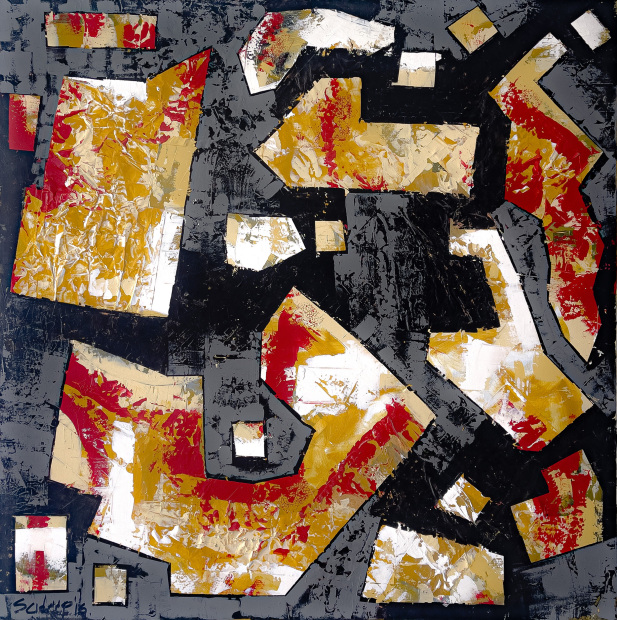 “I feel the energy in a relationship at the brink of separation is quite alive and therefore, the colour scheme of the random geometric forms is a palette of yellows, whites and reds, depicting the vibrant bond in its final state. In contrast, the black and grey background shows finality.