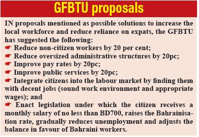According to the GFBTU, 150,000 Bahrainis were working in both the public and private sectors, with the Indian workers numbering at 230,000.