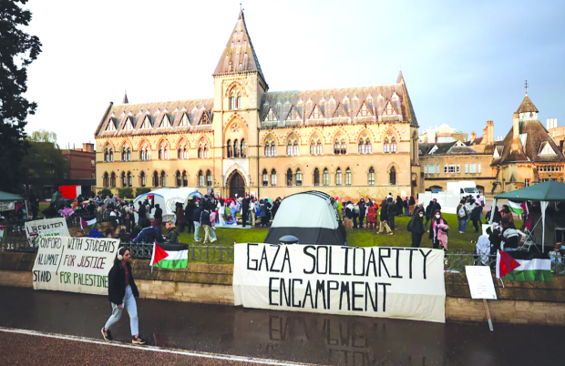 A woman walks near tents at Oxford University, outside Oxford University Museum of Natural History, as students occupy parts of British university campuses to protest in support of Palestinians in Gaza