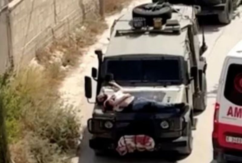 Israeli army forces strapped a wounded Palestinian man to the hood of the military jeep during an arrest raid in the occupied West Bank city of Jenin yesterday. A video circulating on social media and verified by Reuters showed a Palestinian resident of Jenin, Mujahed Azmi, on the jeep that passes through two ambulances.