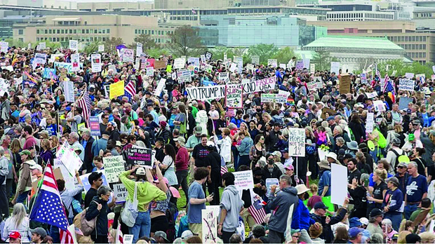 Thousands of protesters gathered in Washington, DC, and across the US yesterday, part of some 1,200 demonstrations that were expected to form the largest single day of protest against President Donald Trump and his billionaire ally Elon Musk since they launched a rapid-fire effort to overhaul government and expand presidential authority.