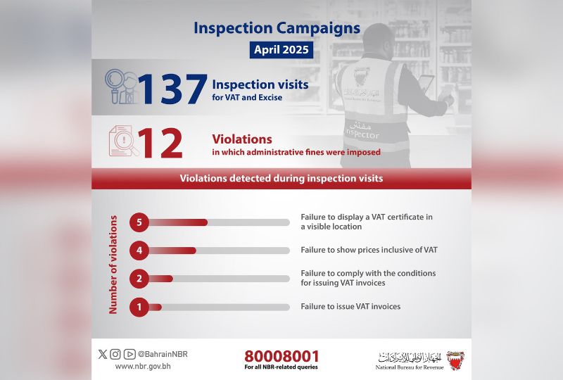 The National Bureau for Revenue (NBR) conducted 137 inspection visits within the local markets across different governates in the kingdom during April.