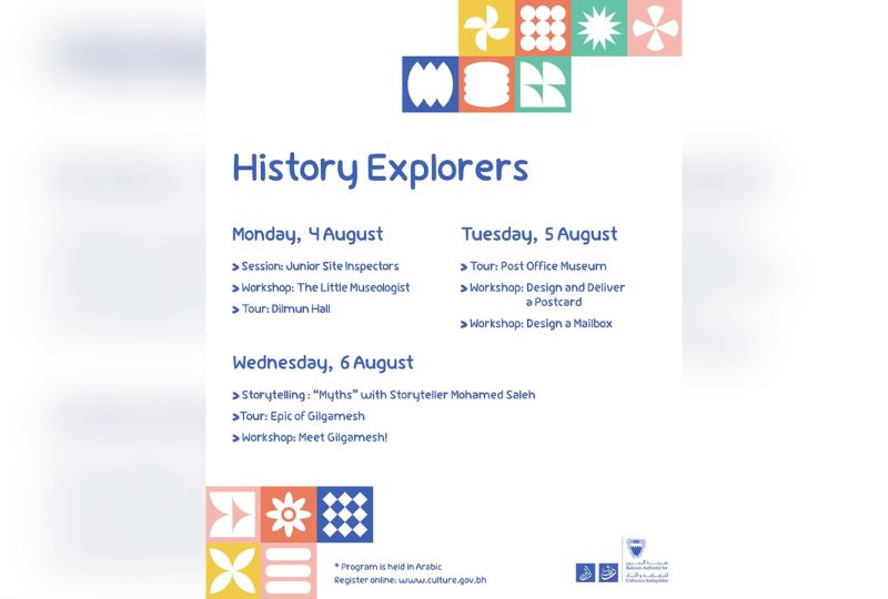 ‘History Explorers’ will kick off the activities from Monday to Wednesday. It will include a ‘Junior Site Inspectors’ session, ‘The Little Museologist’ workshop and a tour of Dilmun Hall.