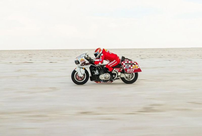 Driven by pro-racer Tyler O’Hara, the modified bagger bike broke a 53-year-old record in the 2000cc APS-AG category. The previous record was set in 1972 by a Triumph motorcycle at 273.311 km/h (169.828 mph).
