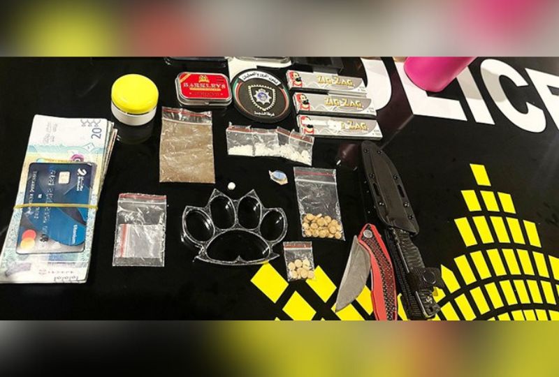 Upon inspection, officers discovered that the driver was in an abnormal condition. A search of the vehicle uncovered a switchblade, a sharp knife, a metal box ring, and several types of narcotic substances—including a bag of crystal meth, three small bags of heroin, and approximately 25 Captagon pills. They also found a quantity of cash, rolling papers, and a bottle containing hashish-flavoured electronic shisha liquid.