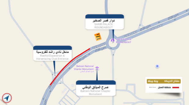 The right lane on Zallaq Highway, from Sakhir Palace roundabout to the Rashid Equestrian and Horseracing Club junction, will be closed as work continues on a new entrance to the club. The closure will be effective from 12 .