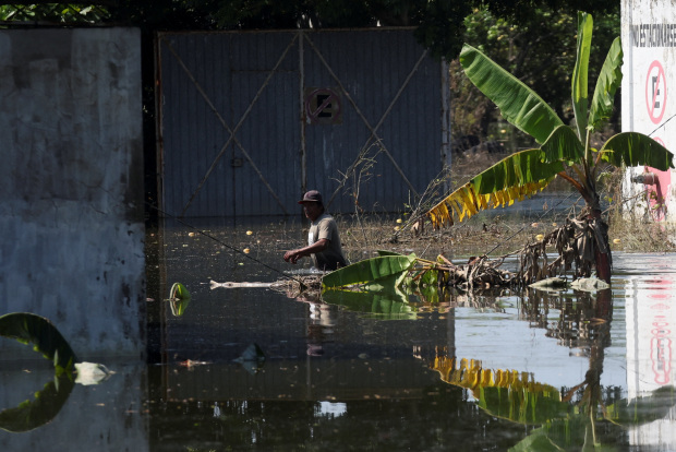 A man wades through floodwaters in the aftermath of a river overflow caused by torrential rains, in Alamo, Mexico, October 17, 2025. REUTERS/Henry Romero