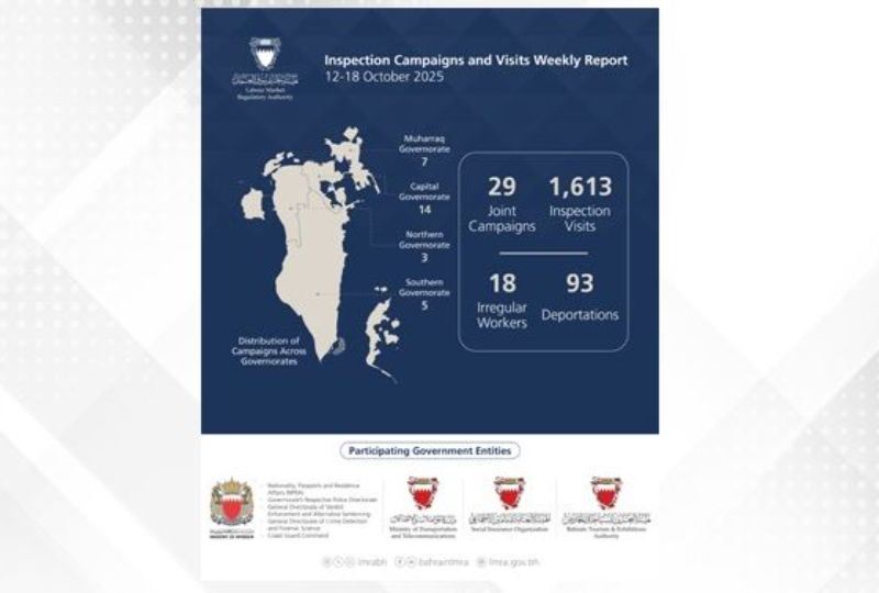 Manama - The Labour Market Regulatory Authority (LMRA) announced the implementation of 1,642 inspection campaigns and visits, during the period of October 12-18, which resulted in the detention of 18 violating and irregular workers, while 93 violators were deported.
