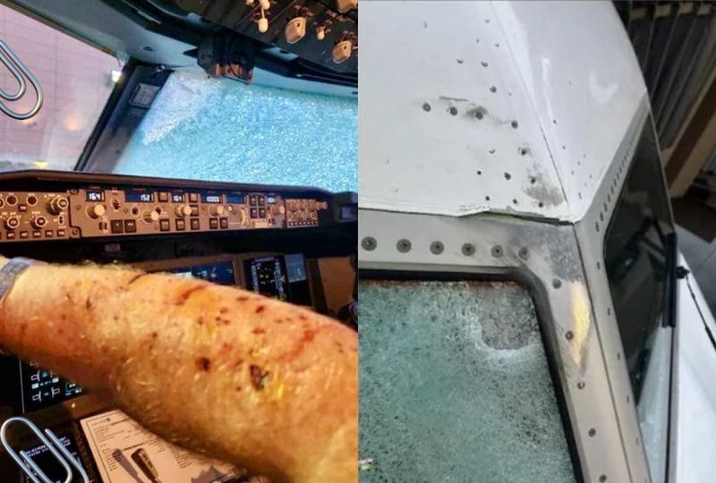 Images circulating on social media showed a shattered windshield with glass debris scattered within the cockpit, and minor injuries on one of the pilots’ arm.