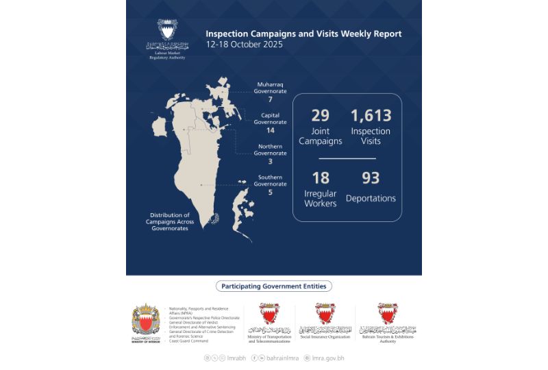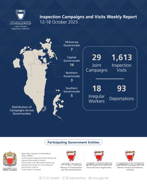 According to the Labour Market Regulatory Authority (LMRA), a total of 1,613 inspections visits were carried out in addition to 29 joint campaigns from October 12 to 18, leading to the identification of 18 irregular workers .