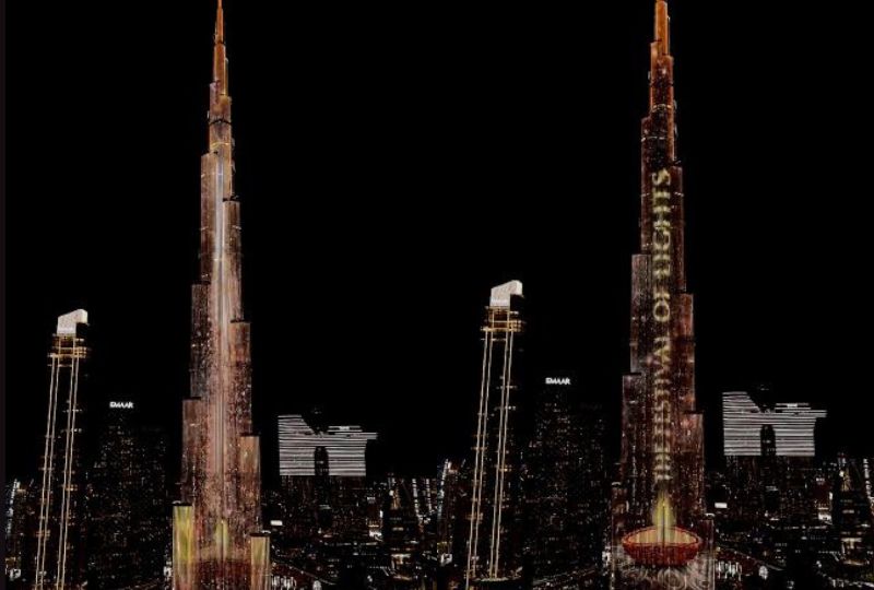 The world's tallest tower showcased bilingual messages across its façade, wishing UAE residents and visitors a joyous festival in both English and Hindi.