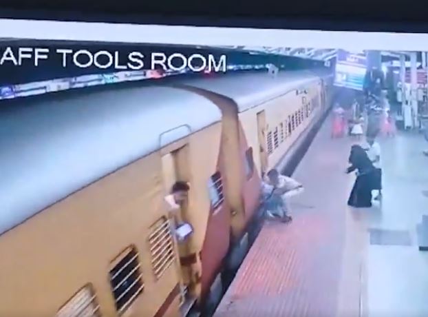 A woman in India slipped while attempting to board a moving train, but was quickly rescued by a station guard.
