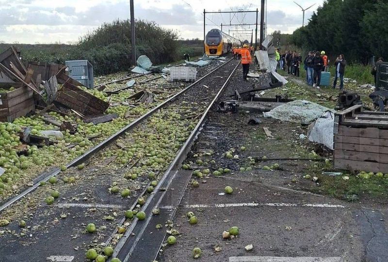 A train ploughed into the side of a fruit truck on a level crossing in the Dutch village of Meteren.