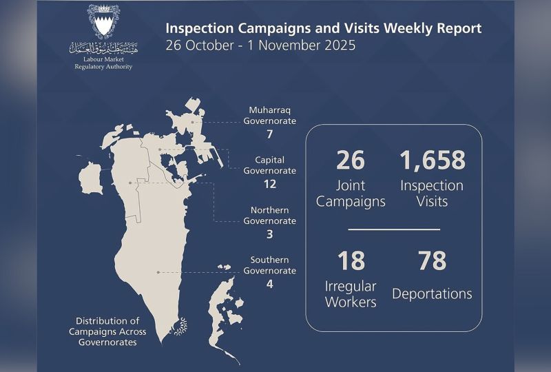 A total of 1,658 inspection visits and 26 joint campaigns, held from October 26 to November 1, also resulted in the identification of 18 irregular workers, said the Labour Market Regulatory Authority (LMRA) in a statement yesterday .