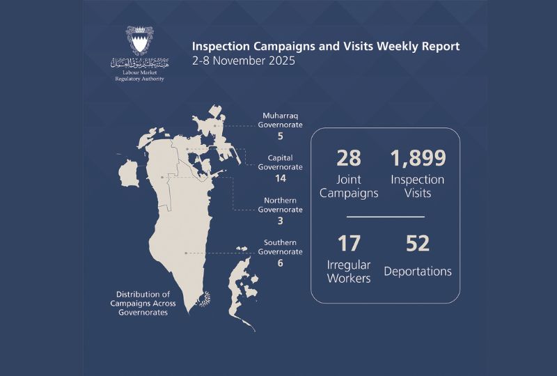 According to a Labour Market Regulatory Authority (LMRA) statement yesterday, a total of 1,899 inspection visits and 28 joint campaigns were conducted from November 2 to 8, resulting in the identification of 17 irregular workers .