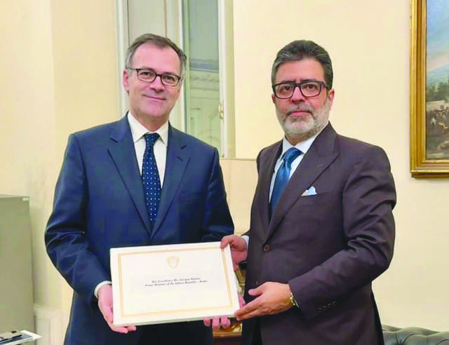 Bahrain’s Ambassador to Italy Osama Al Absi delivering His Majesty King Hamad’s letter to Italian Prime Minister Giorgia Meloni, during his meeting with Italian Prime Minister’s diplomatic adviser Fabrizio Saggio. .