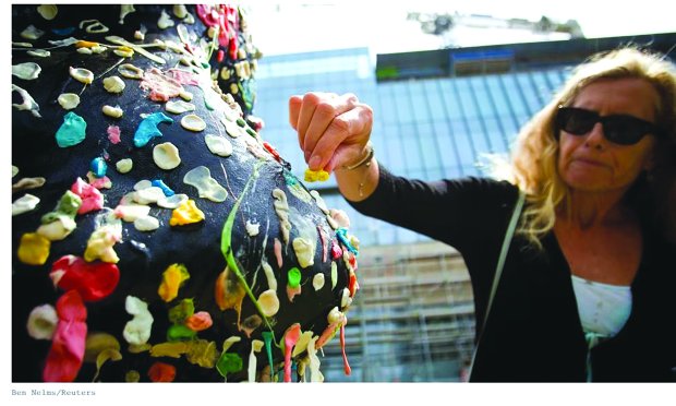 In the meantime, it sticks to sidewalks, building exteriors and public furniture, creating an eyesore and costing municipalities significant sums to clean off.