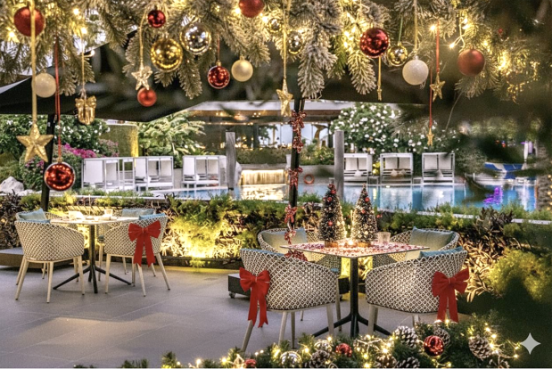 Celebrate Christmas Day with an extraordinary feast featuring live cooking and carving stations, decadent desserts, festive entertainment, children’s activities, and a special visit from Santa Claus. Packages start at BD60 per adult with soft beverages, BD75 for a selected beverage package, BD90 for the bubbly package, and BD25 for children aged four to 12, on December 25 from 12.30pm to 4pm.