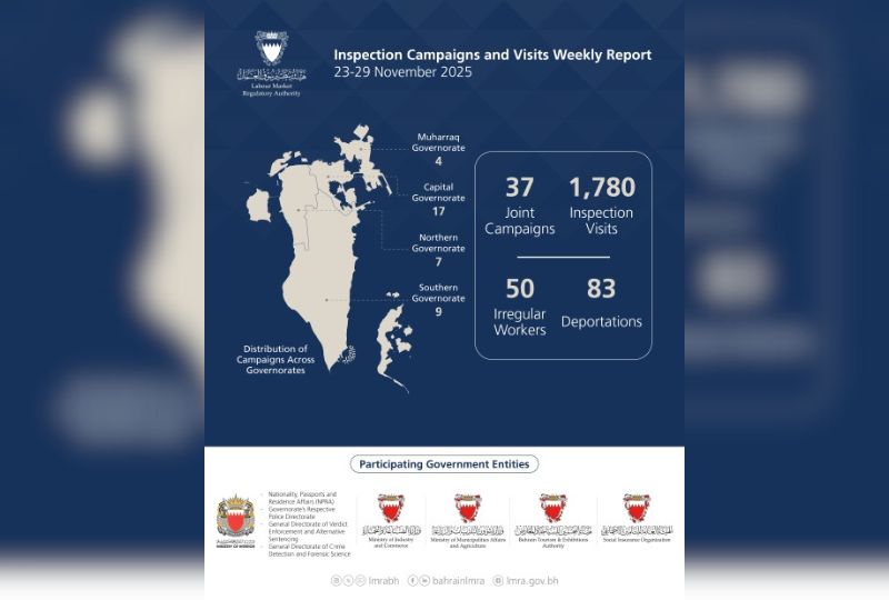 According to a Labour Market Regulatory Authority (LMRA) statement yesterday, a total of 1,817 inspection campaigns and visits were conducted between November 23 and 29, leading to the detention of 50 irregular workers and 83 deportations .