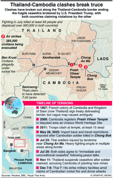 Thailand and Cambodia have for more than a century contested sovereignty at undemarcated points along their 817km land border, with disputes over ancient temples stirring nationalist fervour and occasional armed flare-ups, including a deadly week-long artillery exchange in 2011.