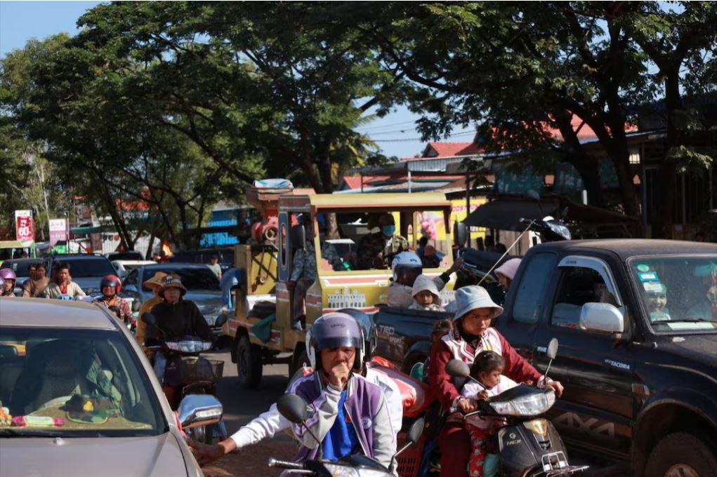 In Cambodia, bottlenecks of trucks and cars formed on country roads and streams of motorcycles and farming vehicles were leaving border areas, local television showed.