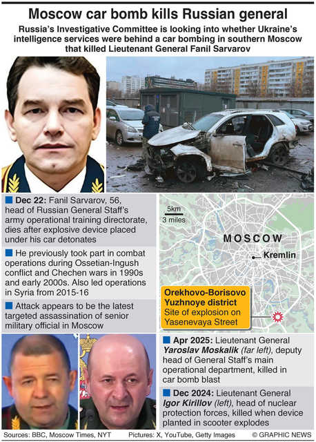 The bomb exploded under the Kia Sorento car driven by Lieutenant General Fanil Sarvarov, head of the Russian General Staff’s army operational training directorate, as he left a parking space at 06.55 Moscow time (0355 GMT).