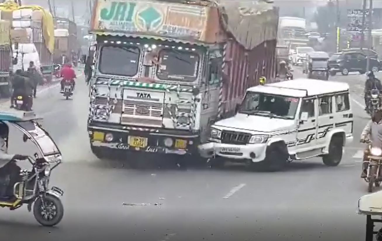 The accident occurred at a highway crossing as the SUV was making a turn. According to police, the truck lost balance after mounting a road divider and toppled directly onto the SUV, completely crushing it.