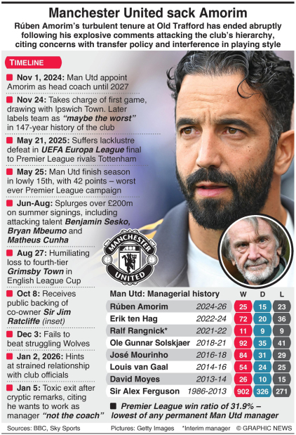 Amorim’s sacking comes four days after Chelsea’s Enzo Maresca also departed after an apparent fallout with his club’s leadership.
